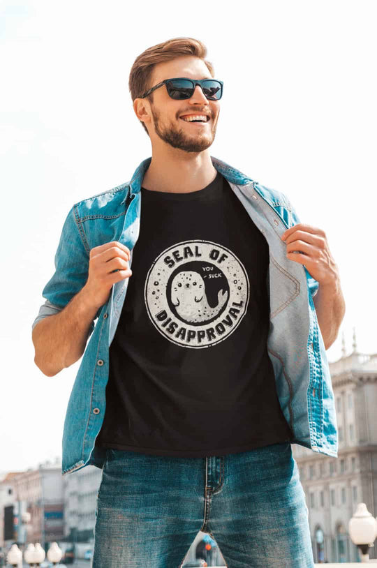 Seal of Disapproval Funny T-Shirt - Black This hilarious novelty tee features a distressed stamp design with a grumpy, cartoon seal in the center. The graphic boldly declares "SEAL OF DISAPPROVAL" and includes the cheeky supplementary...Regular price R329.00 -