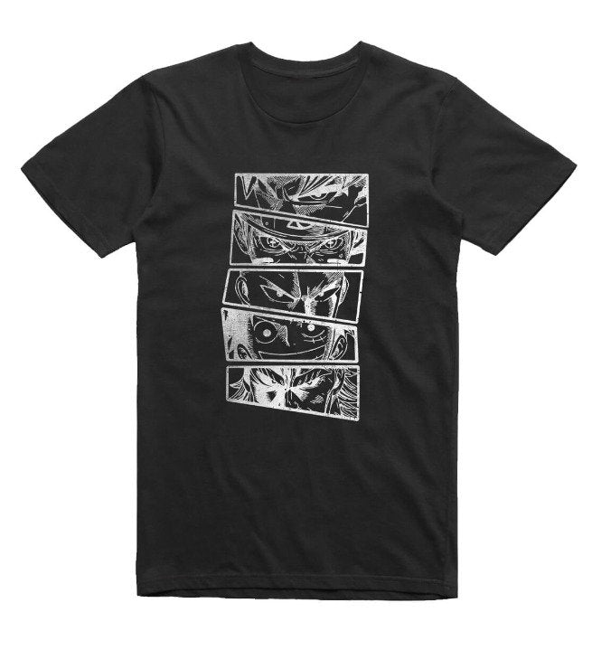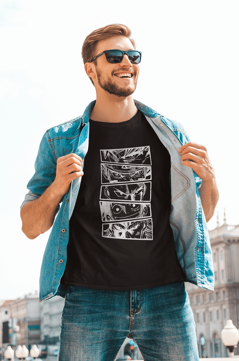 Goku from Dragonball, Naruto, One Punch Man, Luffy from One Piece and One For All from My Hero Academia all feature on this anime-themed t-shirt.